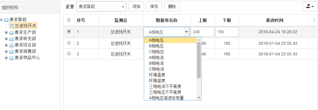 在設備越限設置模塊中可自由選擇監測部門及監測點,然后根據現場實際情況在組織機構右側圖表中添加變量上下限,如下圖所示設置了監測點“總進線開關”的A、B、C三相電壓的上下限值。