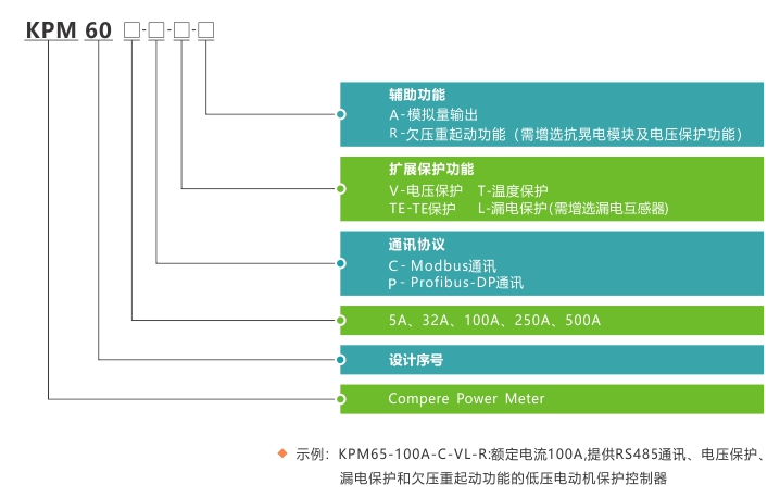 例如:KPM60-100A-VLR 含義即為額定電流100A,提供RS485通訊、電壓保護、漏電保護和欠壓重起動功能的低壓電動機保護控制器。