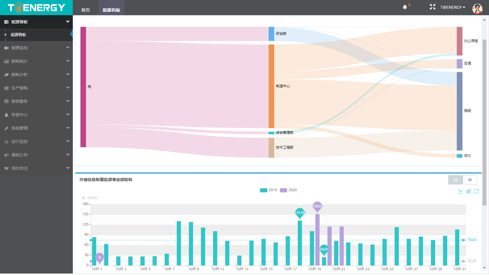 能源管理系統完善計量器具,實現對電、水、氣、暖等能耗介質的計量監測,通過終端實現現場數據采集,利用系統實現集中控制,測量精準同時還能減少勞動力,并且提高計量的自動化水平;建立科學的能源計量體系,合理利用能源,提供能源利用率。通過建設能源管理系統,提高能源管理部門人員的專業性,提高統計工作的精確度,減輕工作壓力;通過精確的數據更容易了解企業用能情況,及時發現企業運轉過程中的能耗問題。