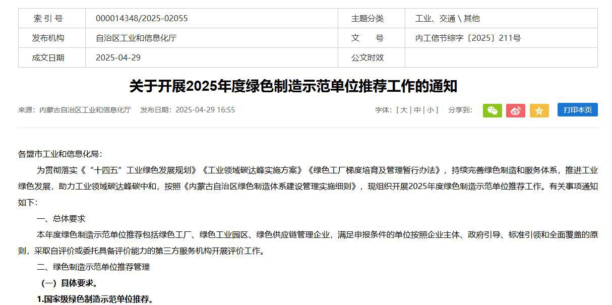 為貫徹落實《“十四五”工業綠色發展規劃》《工業領域碳達峰實施方案》《綠色工廠梯度培育及管理暫行辦法》,持續完善綠色制造和服務體系,推進工業綠色發展,助力工業領域碳達峰碳中和,按照《內蒙古自治區綠色制造體系建設管理實施細則》,現組織開展2025年度綠色制造示范單位推薦工作。本年度綠色制造示范單位推薦包括綠色工廠、綠色工業園區、綠色供應鏈管理企業,滿足申報條件的單位按照企業主體、政府引導、標準引領和全面覆蓋的原則,采取自評價或委托具備評價能力的第三方服務機構開展評價工作。