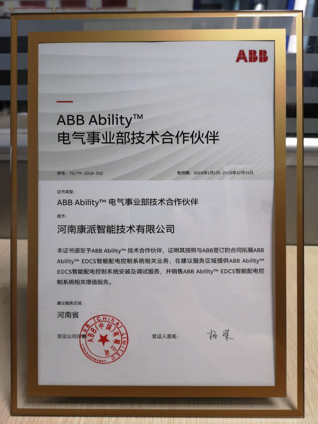 ABB AbilityTM 電氣事業部技術合作伙伴證書,