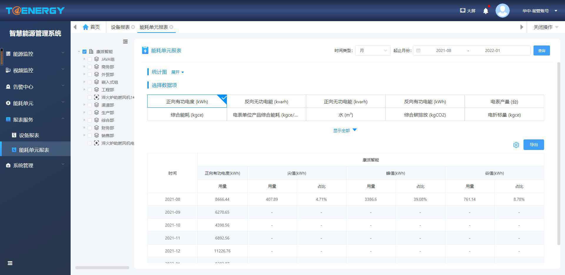 T@Energy智慧能源管理系統(tǒng)主要功能包括能源看板、能源監(jiān)控、視頻監(jiān)控、能耗統(tǒng)計(jì)、能耗分析、報(bào)表服務(wù)、生產(chǎn)管理、告警中心、設(shè)備管理等。下面主要介紹能源監(jiān)控、能耗統(tǒng)計(jì)、報(bào)表服務(wù)、告警中心四項(xiàng)功能: